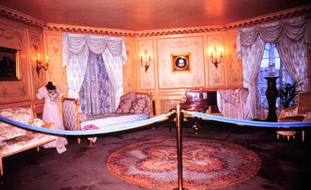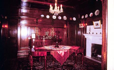 The wonderful entryway combines beveled glass windows, ornate wrought iron, sandstone and a vaulted brick ceiling. The interior features a freestanding spiral staircase, 26 rooms adorned with exotic woods from around the world, hand-painted wallpaper by Marshall Field, several stained glass windows and a redwood paneled fourth floor ballroom.