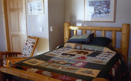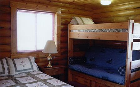 The cozy Bunkhouse Cabins have two individual units in each building. Bunkhouse #1 and #2 share a porch with a view of the Spanish Peaks. Bunkhouse #3 and #4 have a view of the Bridgers. All of the log bunkhouse cabins have a kitchenette, TV, microwave, toaster, coffee maker and shower in the bathroom. Bunkhouse #1 and #3 have a queen bed. They each sleep 2 people. The Bunkhouse #2 has a queen bed along with a twin bunk bed. Bunkhouse #2 cabin sleeps 4. Bunkhouse #4 has a queen bed with a wooden bunk bed that has a full bed on the bottom and twin bed on the top. Bunkhouse #4 sleeps 5.