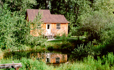 Built in 1996 in the grounds of lovely old Deep Creek House, the cabin has a comfortable western feel while offering every amenity needed for a truly restful stay. The open floor plan and high ceilings make for plenty of elbow room and a sense of space. Four can sleep here, and there is a full bathroom with tub and shower and plenty of storage space. Too relaxed to do anything' Then sit a while in one of the overstuffed rocking chairs by the large picture window - the perfect spot for watching wildlife of just reading one of the many good books from the selection on the shelves. Or laze in the sun by one of our two stream fed ponds and watch the brook trout rise and swirl.