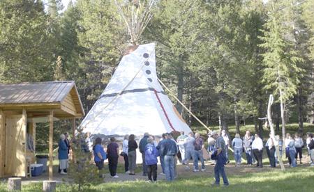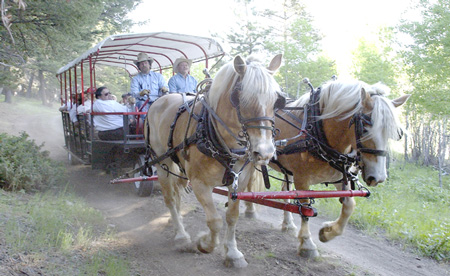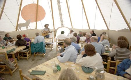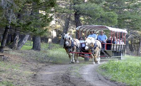 Last Chance Ranch presents Wagonride Dinners at the Moose Meadow Tipi. Experience an evening of good food and good times you're sure to remember for years to come! Travel back in time via our horse drawn wagons through high mountain timber to the Moose Meadow Tipi (Montana's largest Indian Tipi). Enjoy a great gourmet meal like Fresh Garden Salad, Homemade Rolls, Prime Rib, Potatoes du jour, Steamed Vegetables, Huckleberry Cheesecake and Cowboy Coffee all served up family style. Live western entertainment by Montana's own Bruce Anfinson rounds out this unique evening. Musical tribute to Lewis and Clark. Guaranteed fun! Great event for company parties, wedding dinners, reunions, or tour groups.
