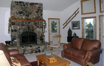 The living room has cushy leather sofas situated around the grand river rock fireplace. It also has a stereo with a CD player. There is additional gathering space up in the loft for those that want to watch a video ( no satellite or cable service at this home). Also, the lower level of the home has a partially furnished game room with a ping pong table. There is also a table for playing games or working on puzzles, etc.